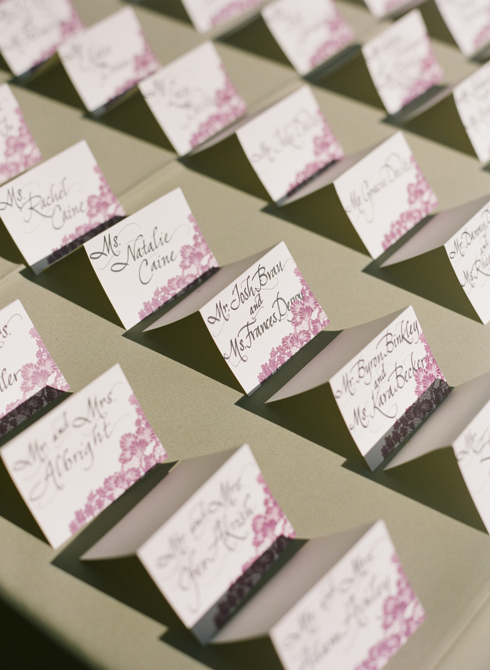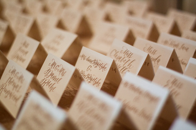 Whatever creativity you do use, Sozmen says that ‘etiquette for the escort cards should follow the formality of your event. If guests were addressed as Mr. and Mrs. John Smith on the invitation then the escort card should be in the same format. A more casual invite and escort card would be Kate and John Smith.’
