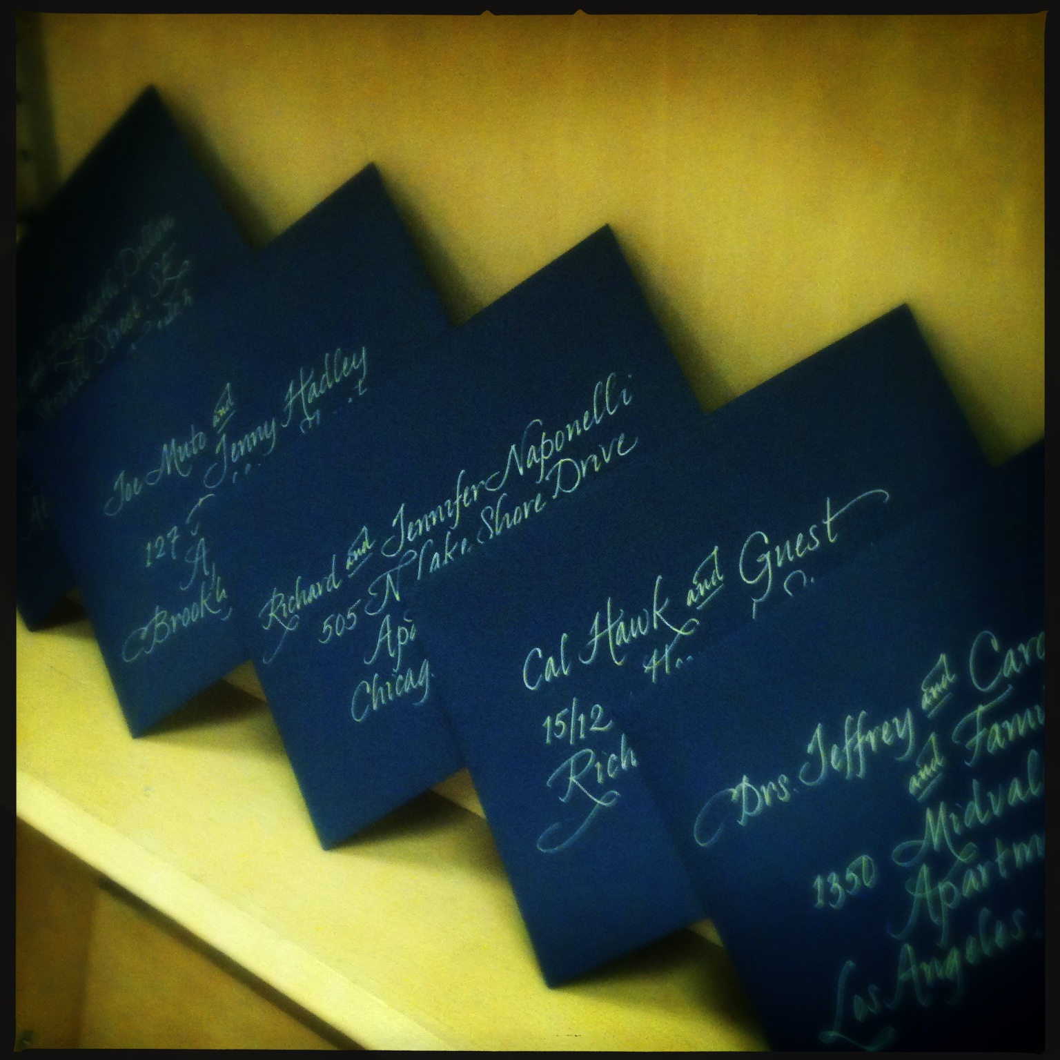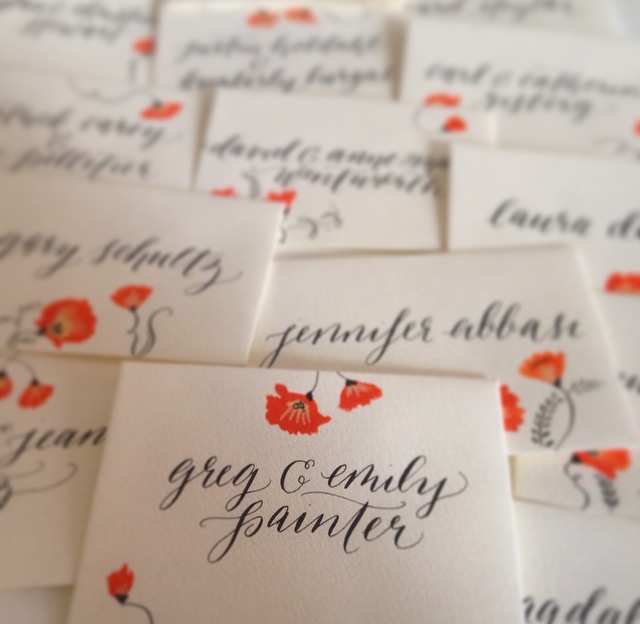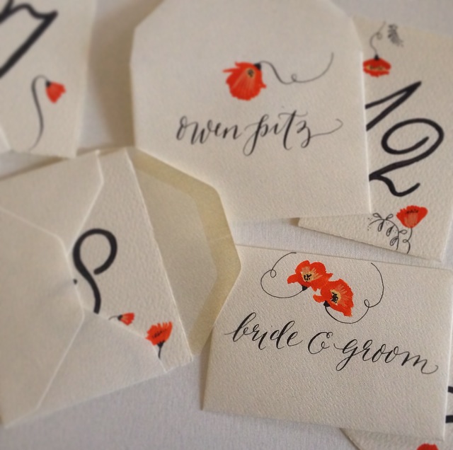 Hand Painted Table Number Cards and Escort Cards. I used North Wind White Ziller Ink on Paper Source Stock.