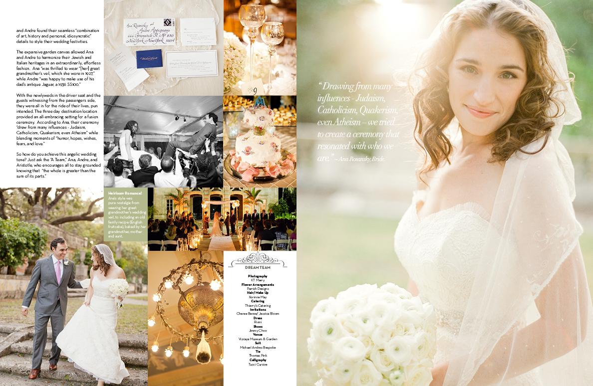 I was part of Ana and Andre’s Dream Team which included destination photographer KT Merry, and Invitation Designer Cheree Berry, among others. A destination wedding, the ceremony took place at the Vizcaya Museum and Gardens.