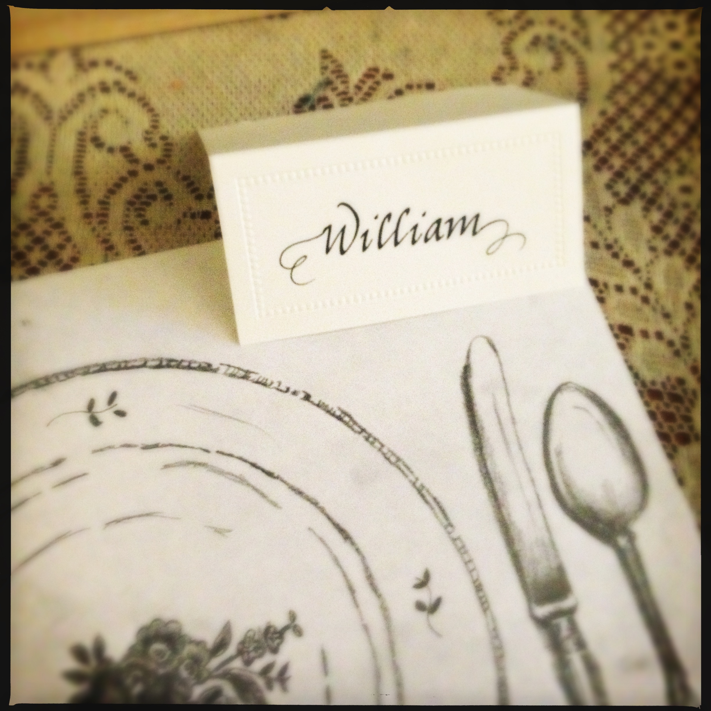 You can always add a little elegance to your own small parties and events by adding a special touch – yours! This is my own place mat sketch, but the folks at Cake Vintage are the masters of beautiful paper placemats and serving papers. Printed on recycled paper with soy ink, the papers give any simple meal, an elegant feel.