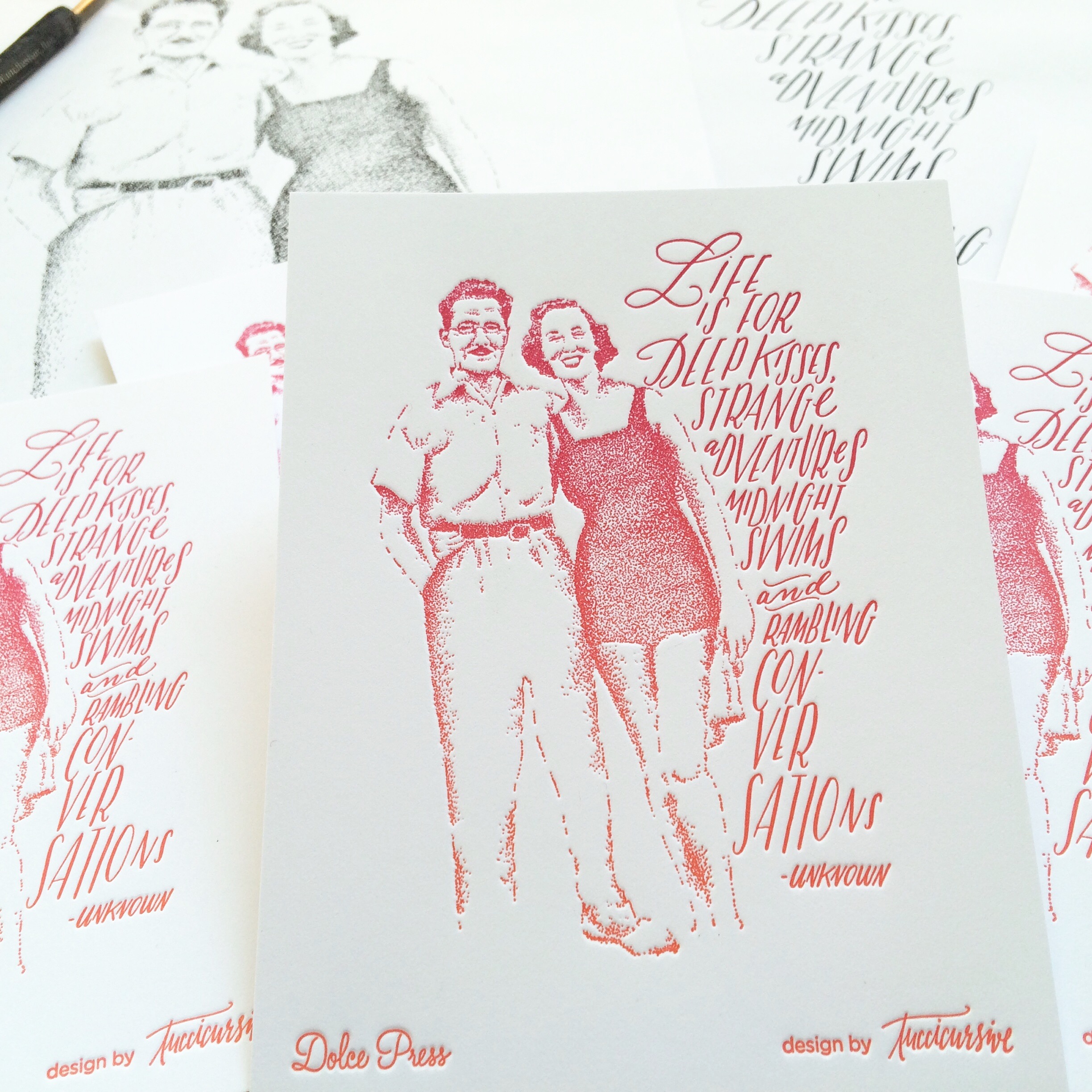 Sketched and Brush Illustrations and Brush and Pointed Pen Hand Lettering are done exclusively by myself. Cards are Digitally Printed and lovingly printed in Saugerties, New York by Kate Murray of Quick Brown Letterpress.